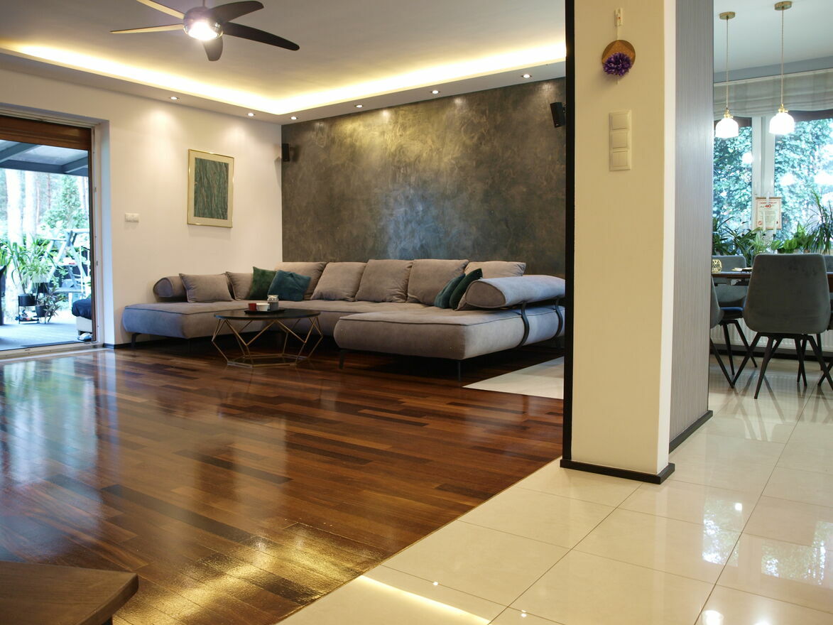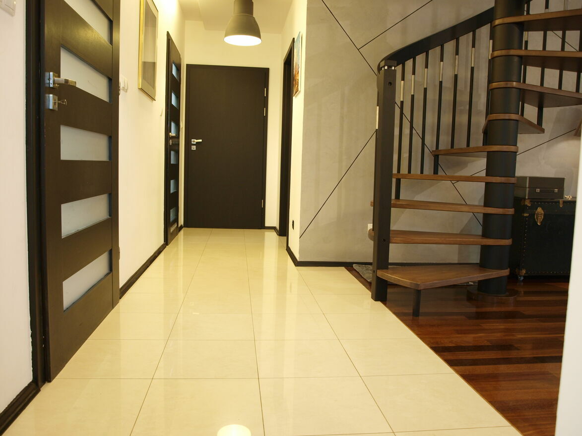 - na podłogach w salonie oraz na poddaszu parkiet egzotyczny Sucupira, w pozostałych pomieszczeniach gres włoski polerowany;