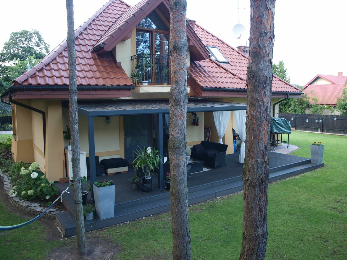- na tarasie pergola aluminiowa (z zadaszeniem przyciemnianym poliwenglanem);