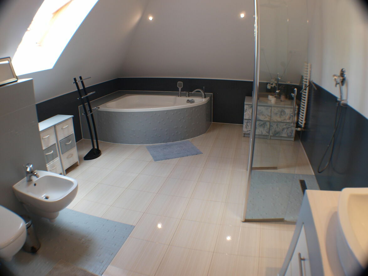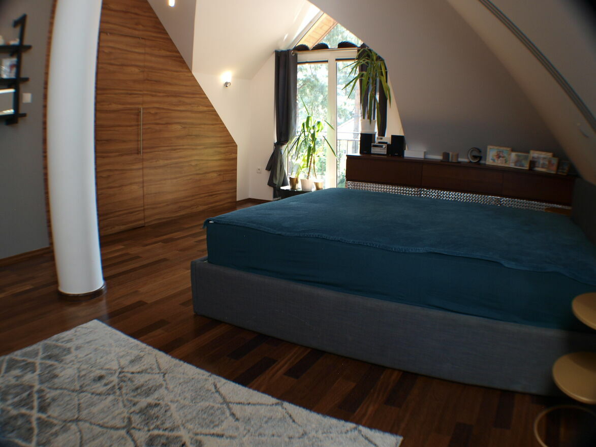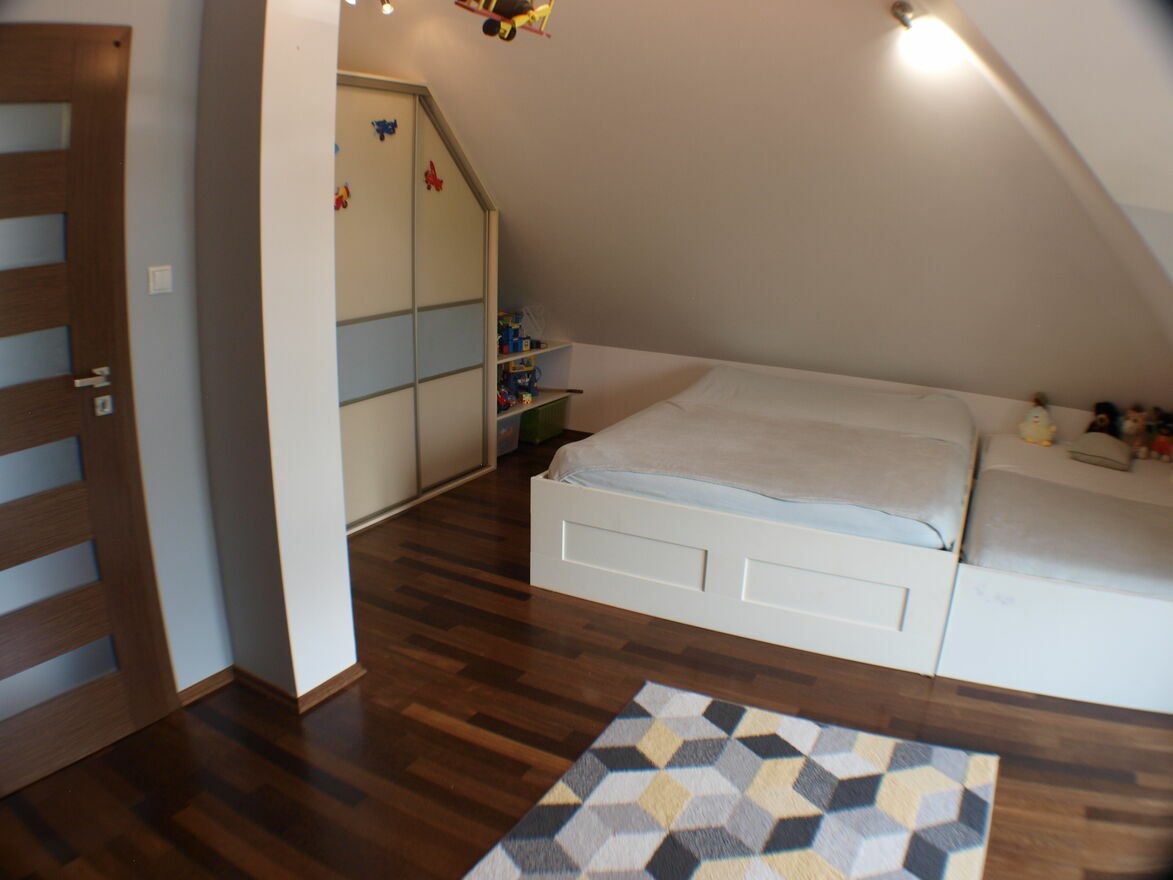 Na poddaszu znajdują się 3 sypialnie łazienka ( z wanną oraz prysznicem) oraz strych. W jednej z sypialni znajduje się zabudowana garderoba, druga zaś w obszerną szafę wnękową.